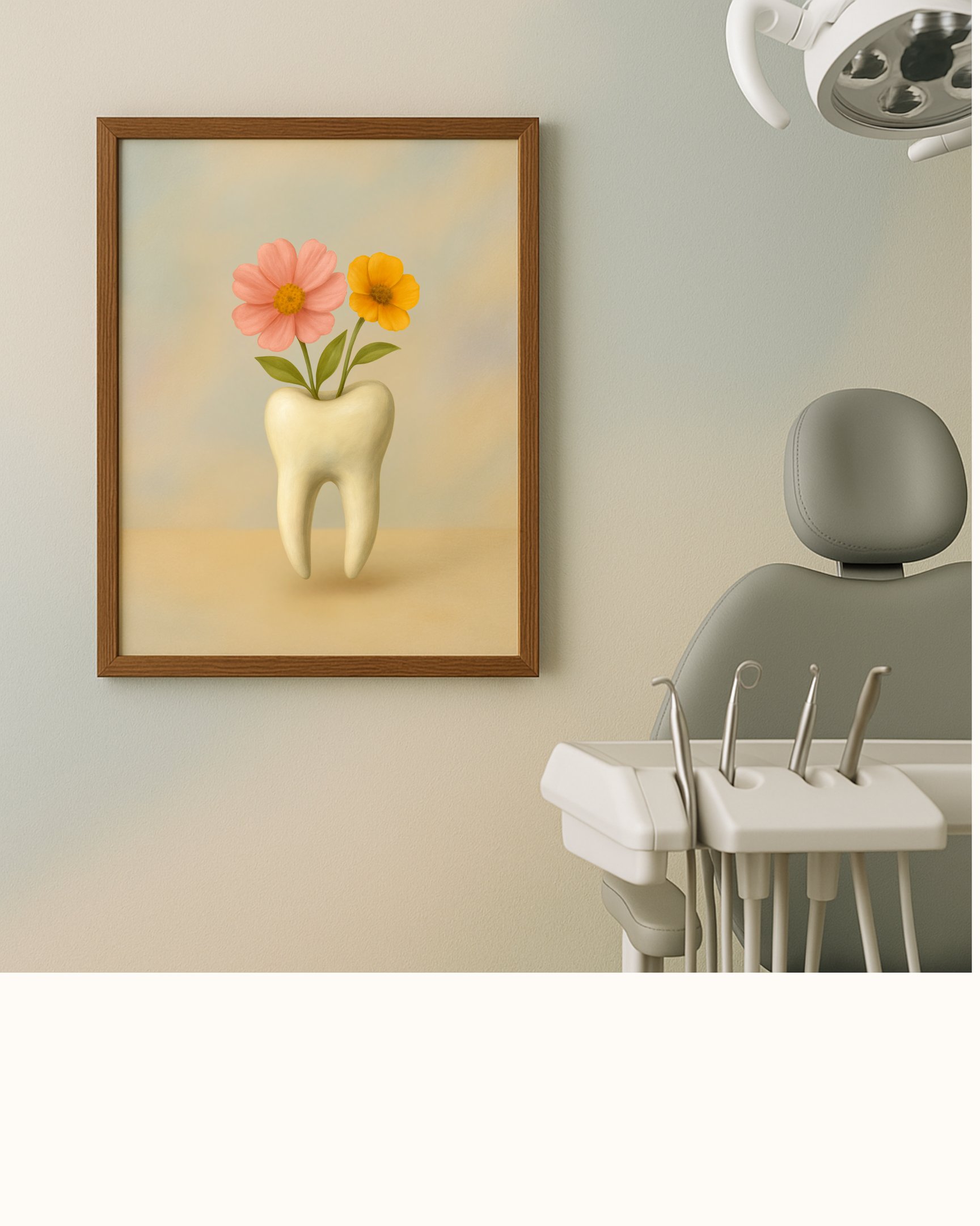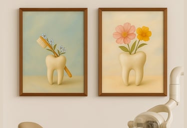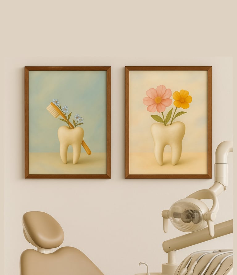 Thoughtfully illustrated tooth prints that make dental clinics feel welcoming, calm, and beautifully designed. Framed in rustic wood with real glass.
